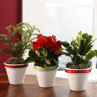 Use a hot glue gun to adhere one strip of ribbon around the mouth of each pot. If you choose to attach gift tags, slip the tag onto the ribbon before gluing the ribbon to the pot.
